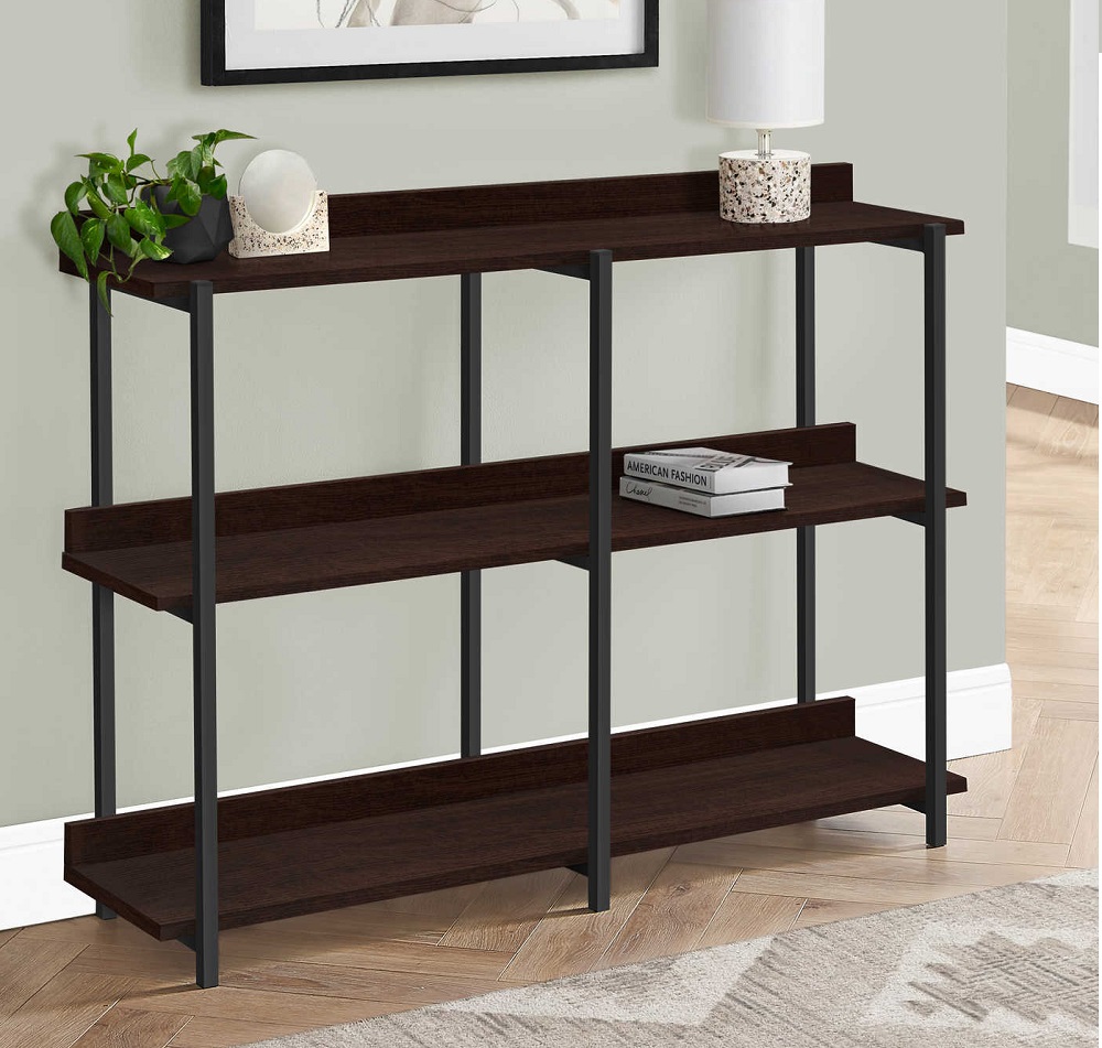 - 3-tier console table featuring a long, rectangular tabletop and 2 storage shelves in a elegant dark-brown espresso finish